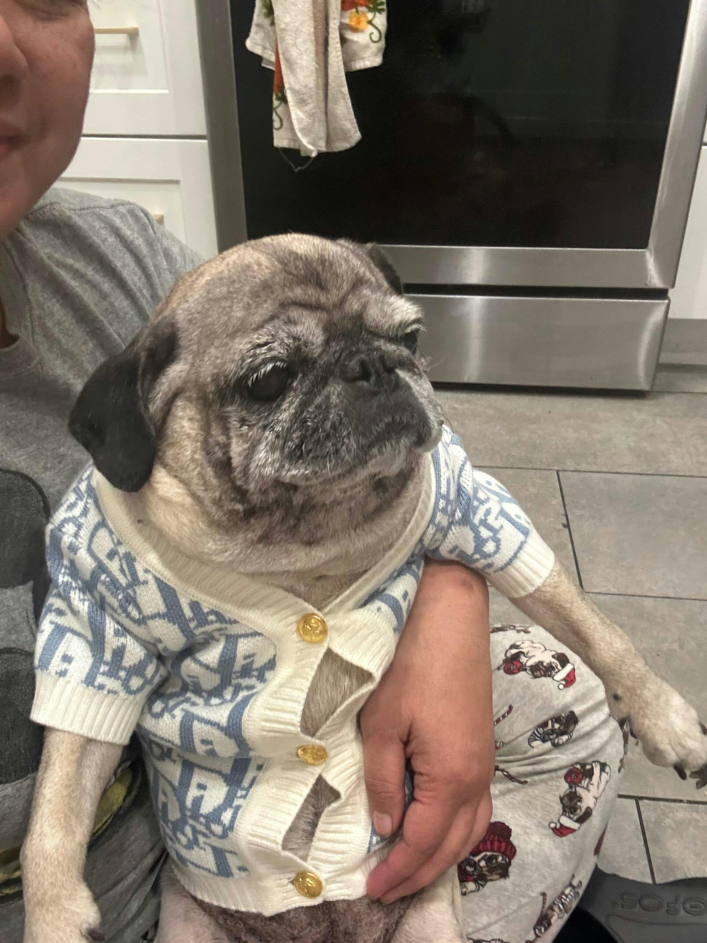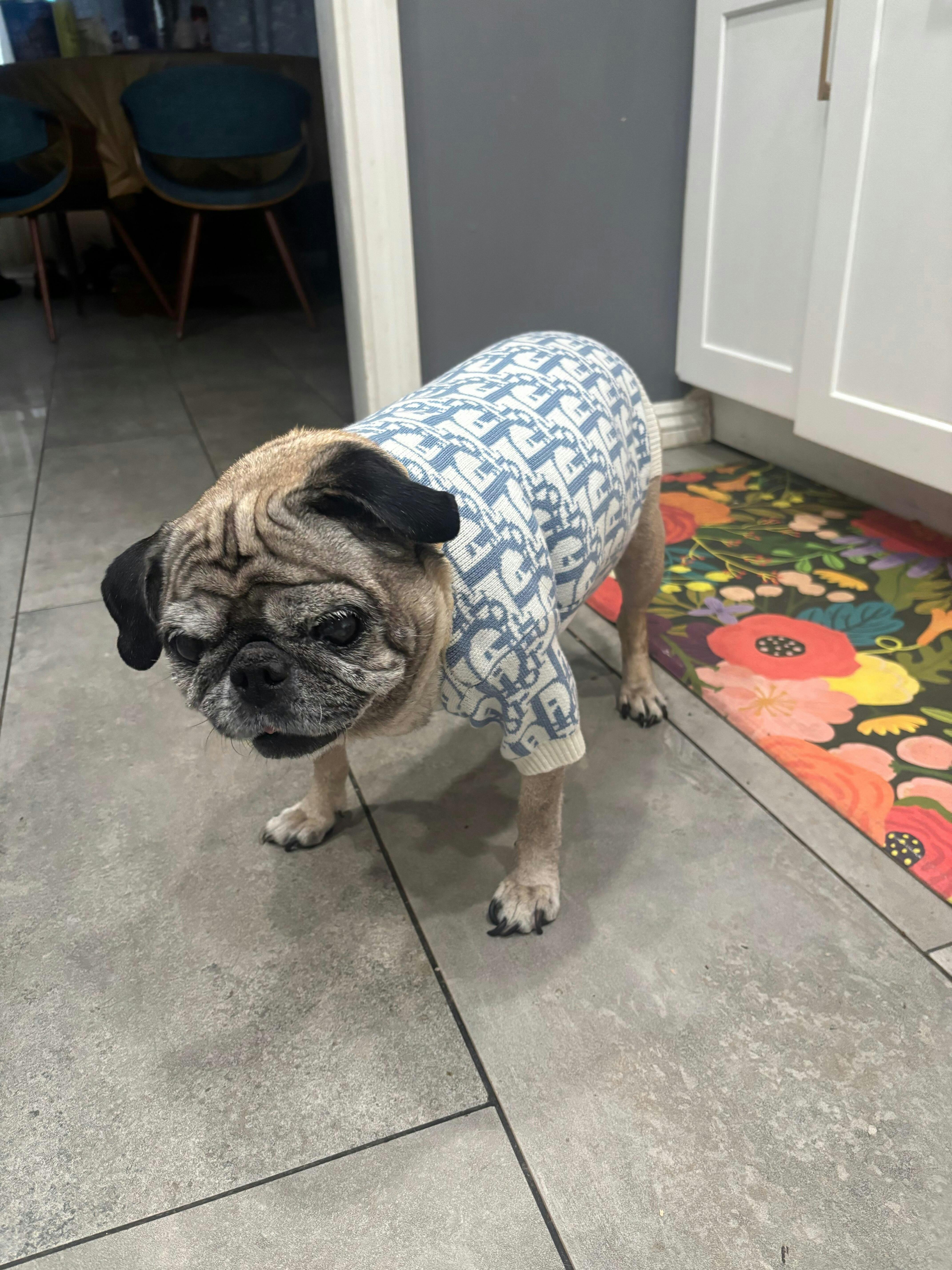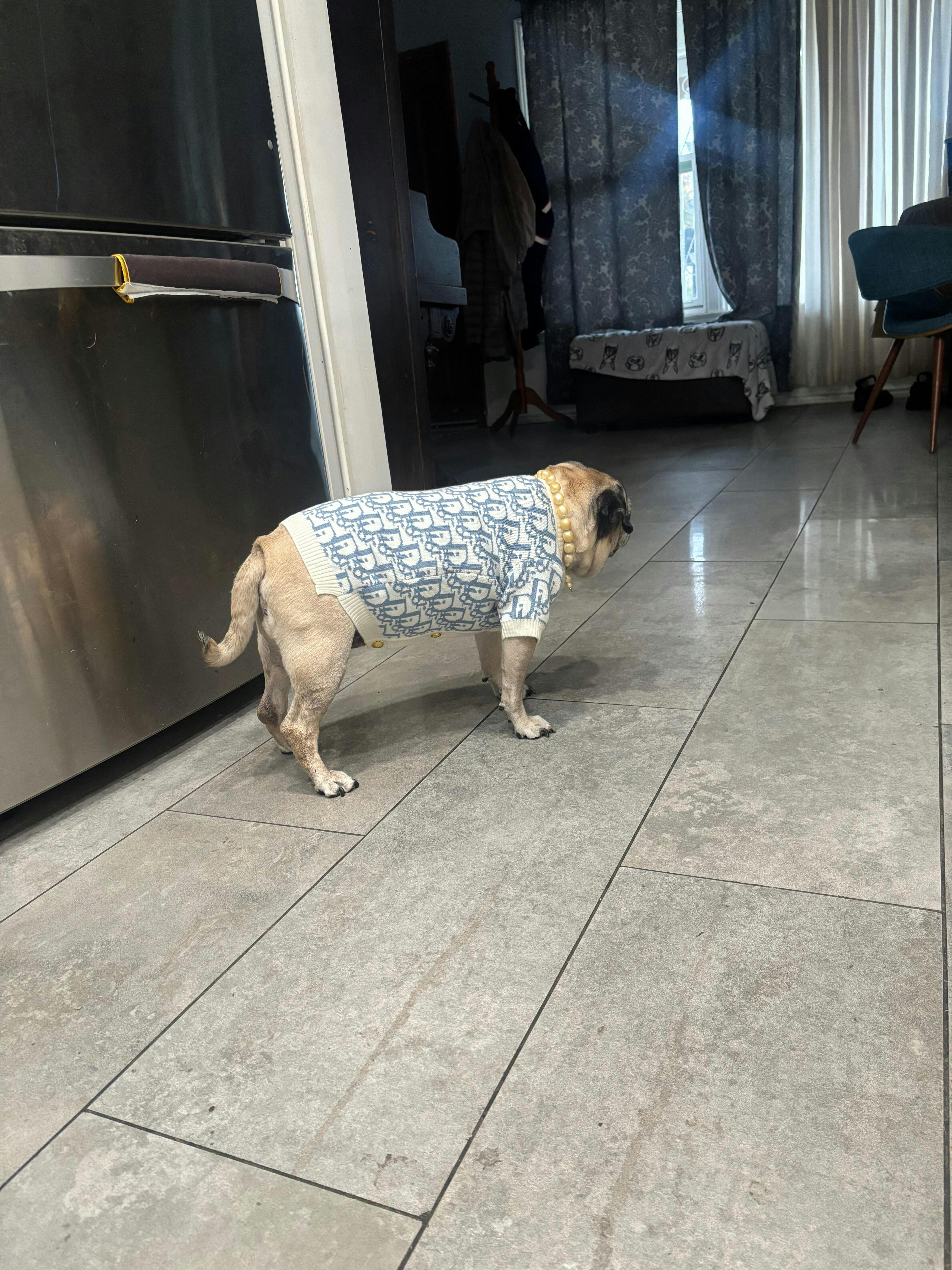 This sweater is both cute and classy! The light blue and white pattern gives it a designer vibe, and the fit looks comfortable without being too tight. It sits nicely around the chest and shoulders, and the sleeves don’t seem to restrict movement. Perfect for keeping a senior pug warm while still looking fashionable. Overall: 10/10 — cozy, stylish, and pug-approved!